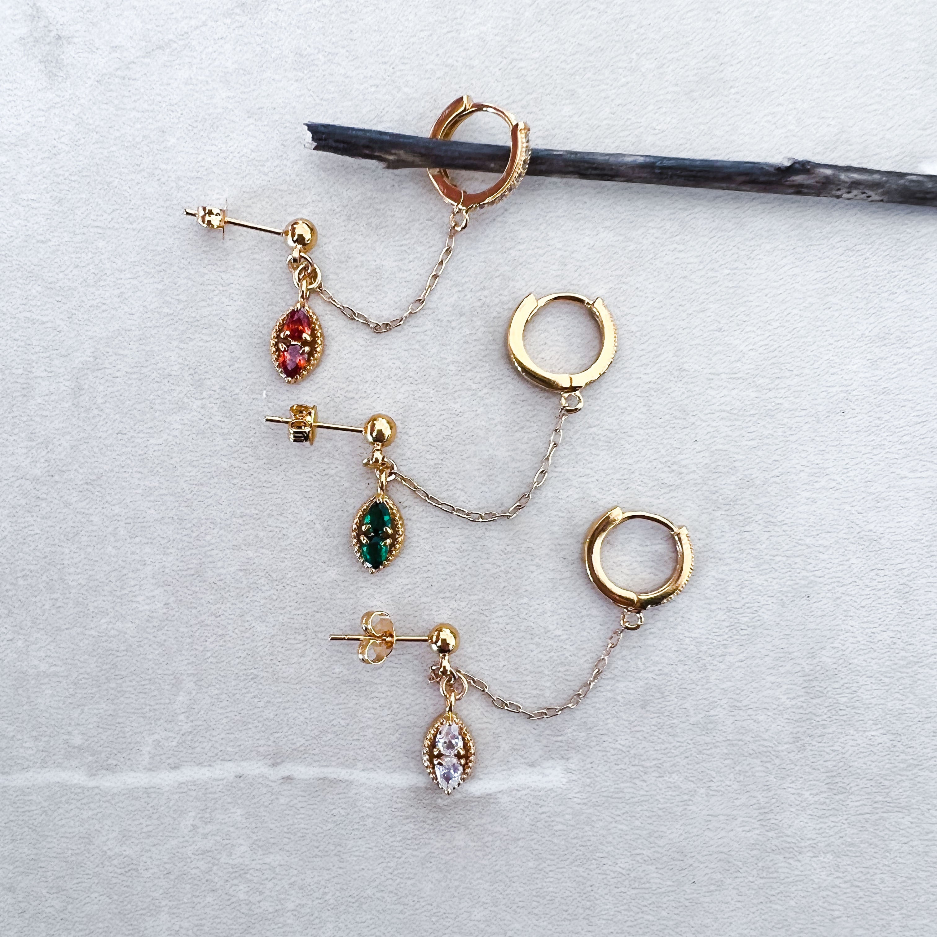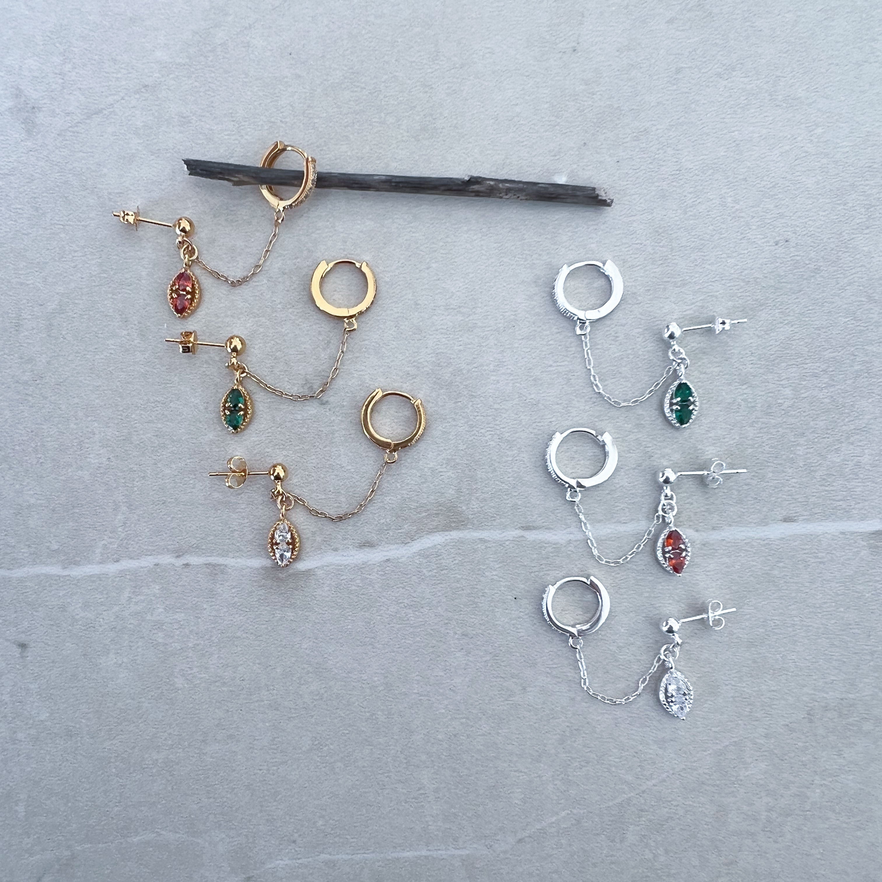 Boucle créole sertie de zircons reliée par une chaine à une puce d'oreille pendentif serti de zircons de couleur