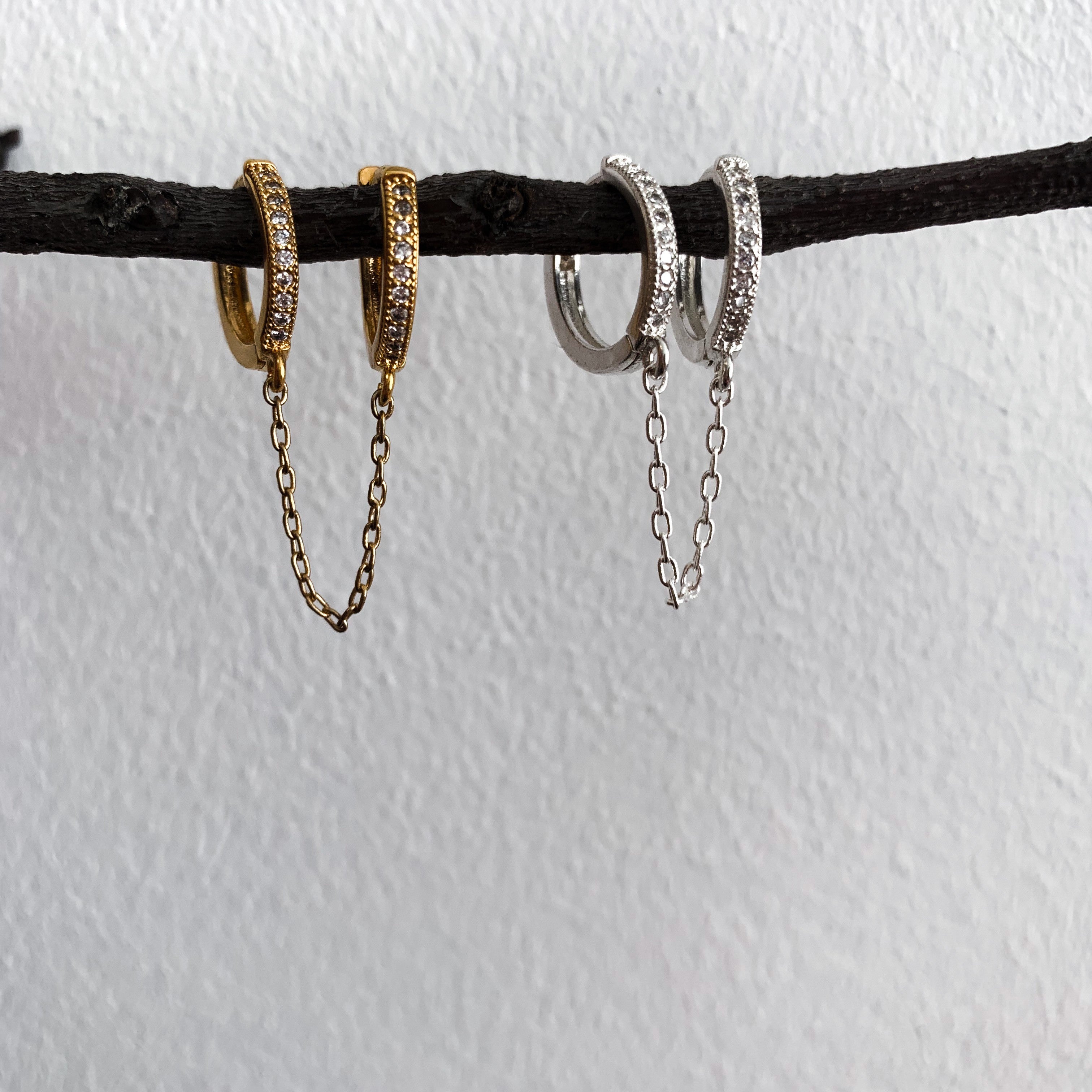 Petites Créoles Doubles Serties de Zircons avec Chaîne Reliée