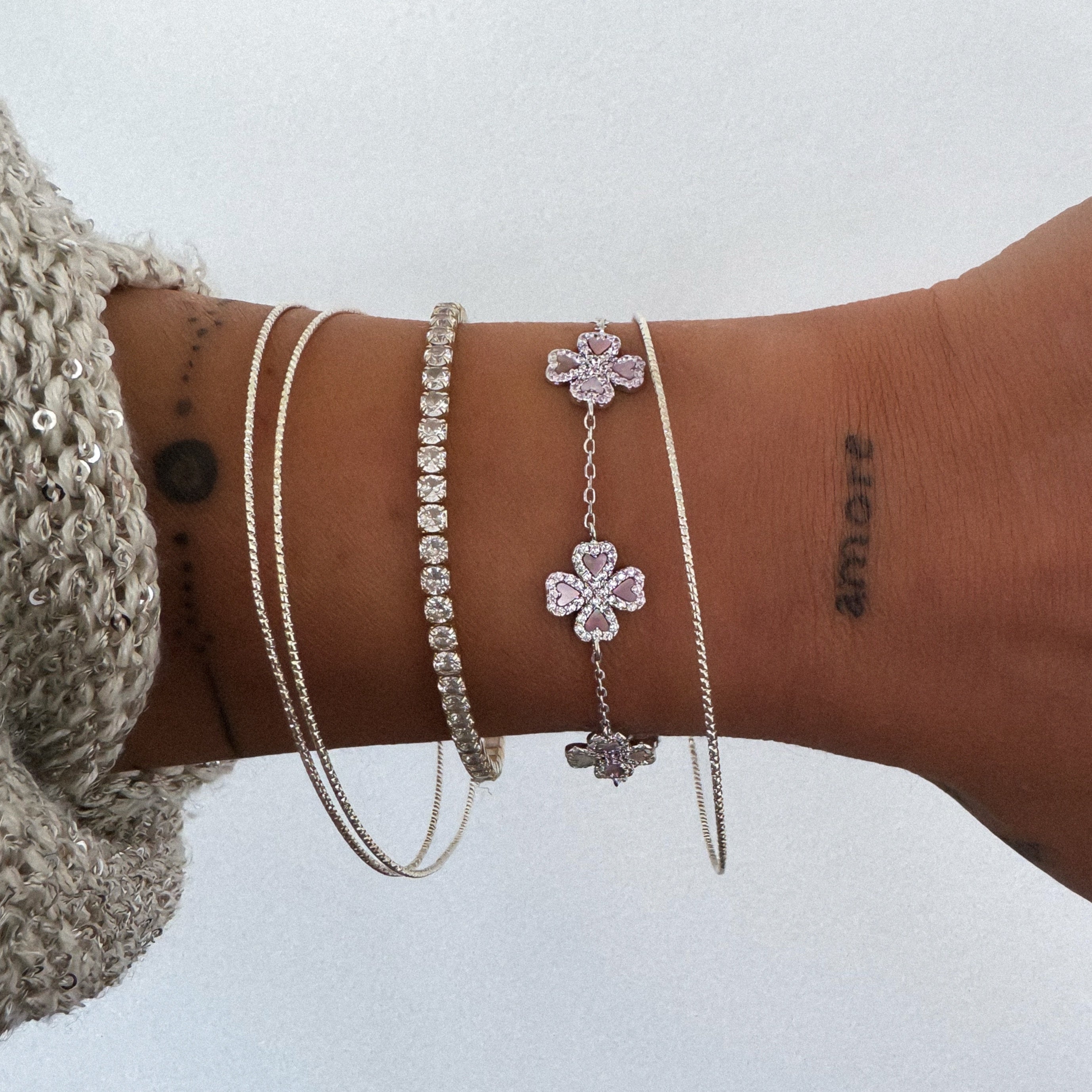 5 trèfles à 4 cœurs en nacre rose clair, délicatement sertis de zircons pour une brillance subtile
