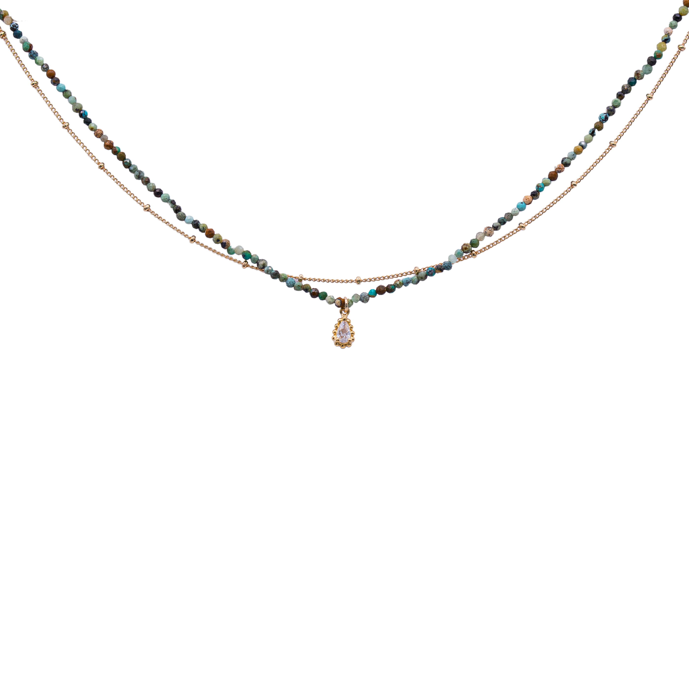 Collier double chaîne fine agrémenté de perles naturelles colorées au choix et d'une petite goutte en zircon.
