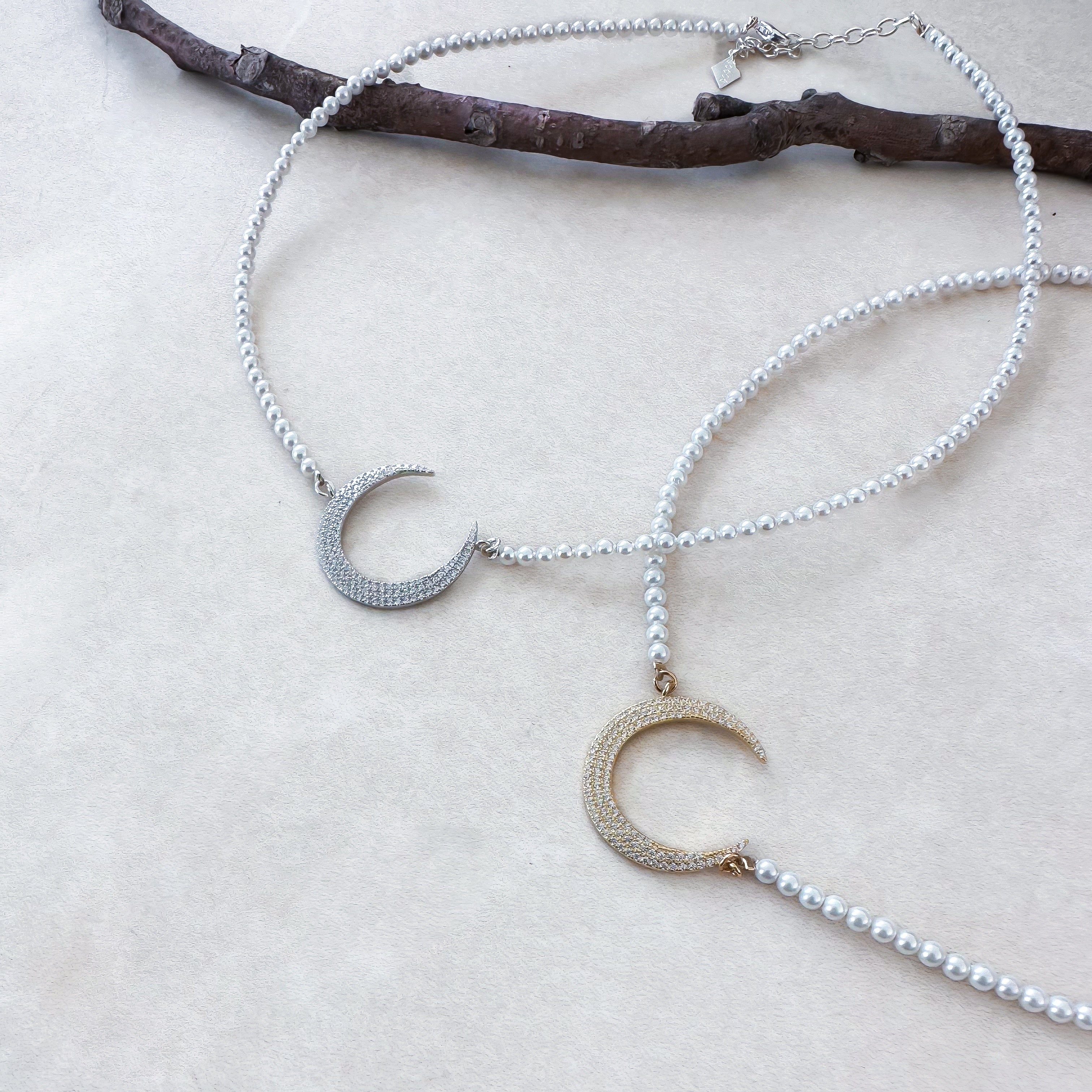 Raffiné collier orné d'un grand croissant de lune serti de zircons, suspendu à un délicat collier de perles de nacre.